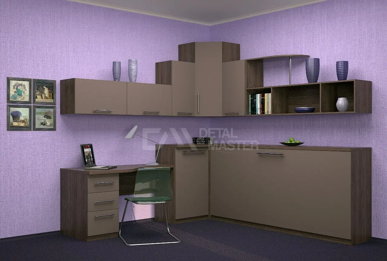 Горизонтальная шкаф-кровать со столом и верхними модулями для подростков "Teen Max ".  Шкаф-кровать работает на механизме раскладывания собственной разработки "Start". Кровать раскладывается легким движением руки, превращаясь в полноценное спальное место. Просто потяните ее за ручки, расположенные на фасаде и выставите ножки-опоры.