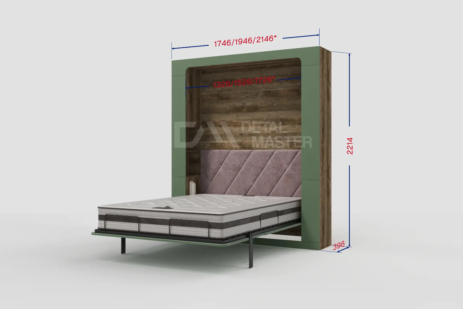 Фасад шкаф-кровати выполнен из МДФ супер матовый Фисташка, со сглаженными краями. Что позволит обезопасить вас от ударов при ходьбе возле кровати в разложенном положении и добавит изысканность модели шкаф-кровати. Корпус выполнен из ЛДСП декор Кейптаун. По бокам модель оснащена полками для хранения вещей с закрывающимися дверцами.